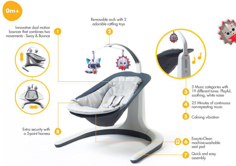 Innovative dual motion wire-free bouncer that offers the perfect combination of soothing sways and entertaining bounces, creating a unique experience that envelops baby in a natural environment that supports the development of EQ.